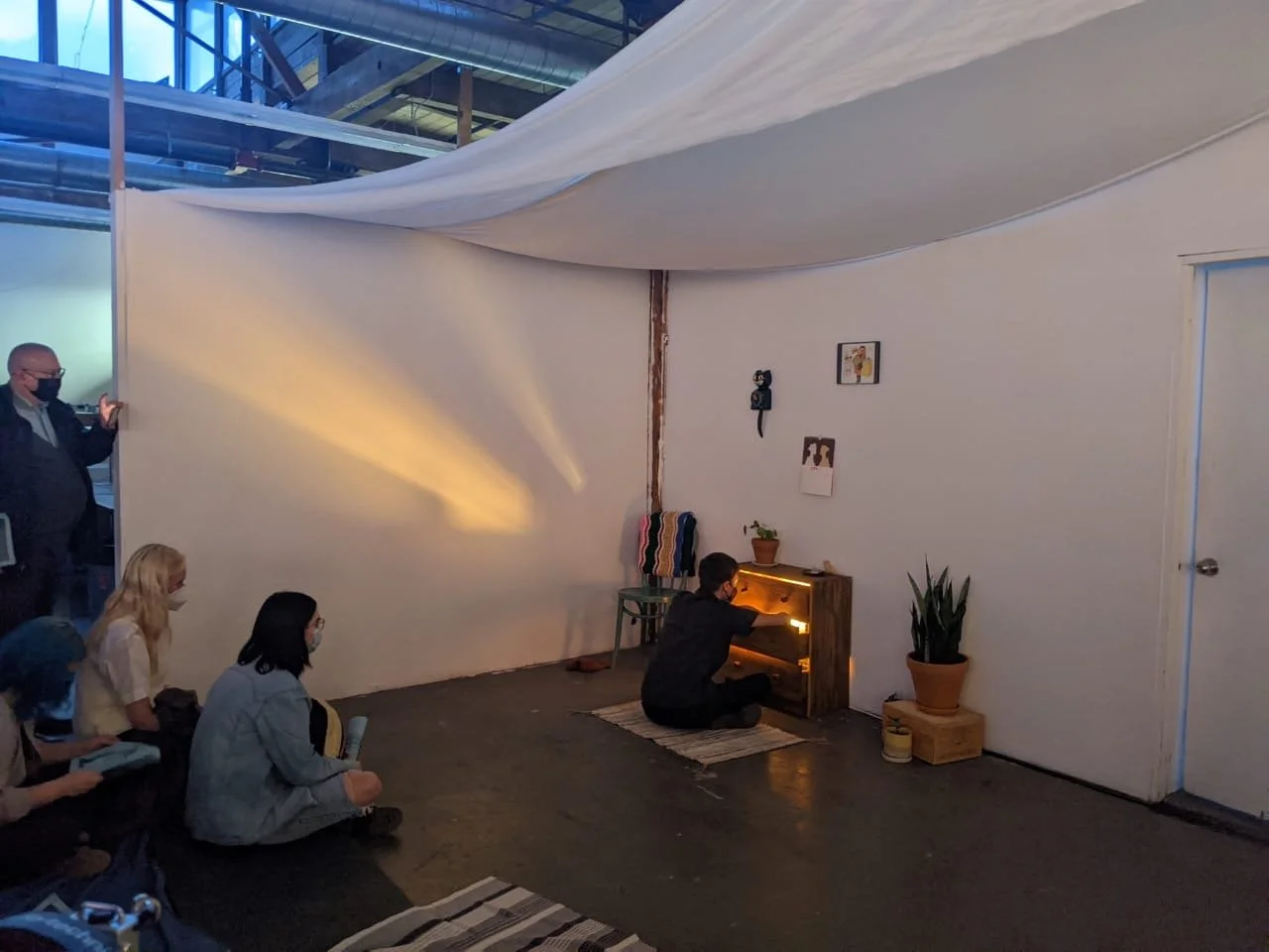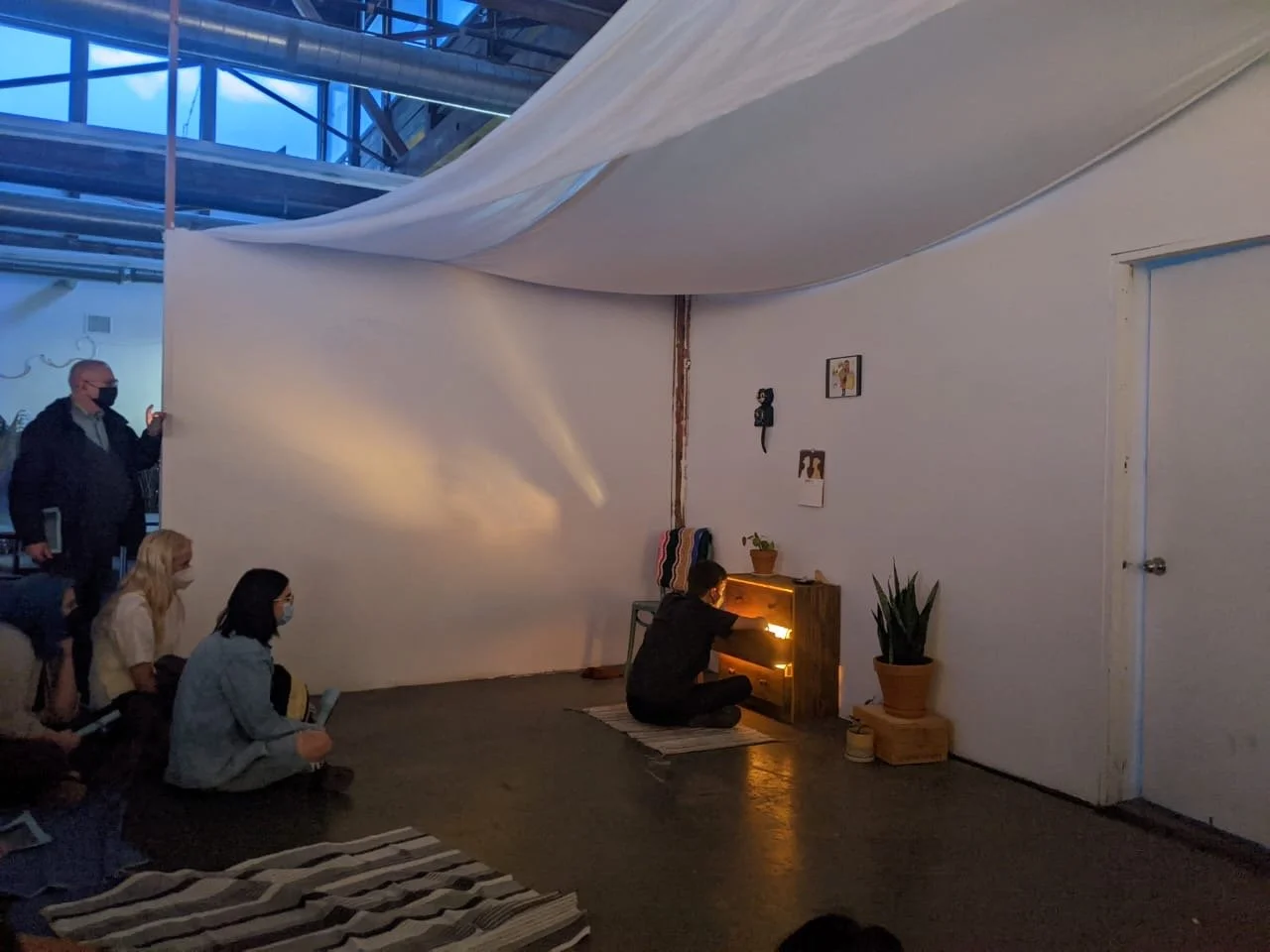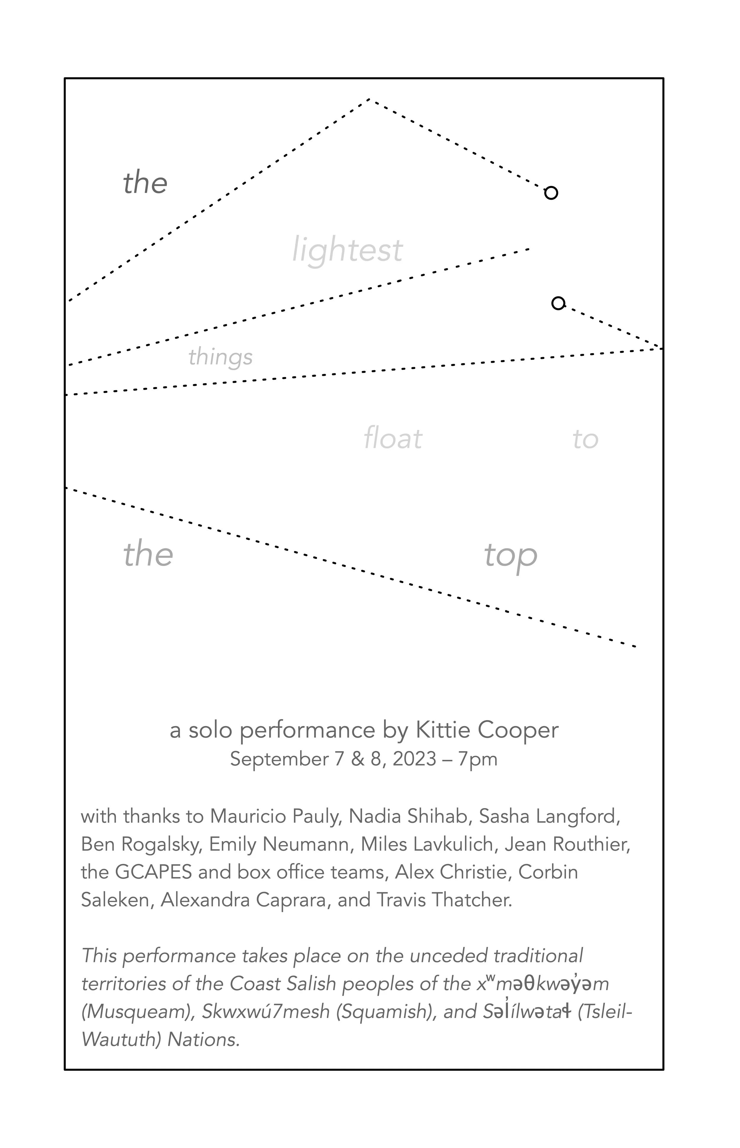 the lightest things float to the top is an intermedia instrument and solo performance for sound, light, and objects by Kittie Cooper. Kittie’s sound art practice centers around found sound and objects, and amplifying the memories held by these things. In the lightest things float to the top, Kittie takes a similar approach to composing light and shadow—reimagining lights from familiar spaces as an intermedia instrument. Patterns of the everyday, and their minute variations, provide the creative material and a gentle form for this semi-improvised performance.