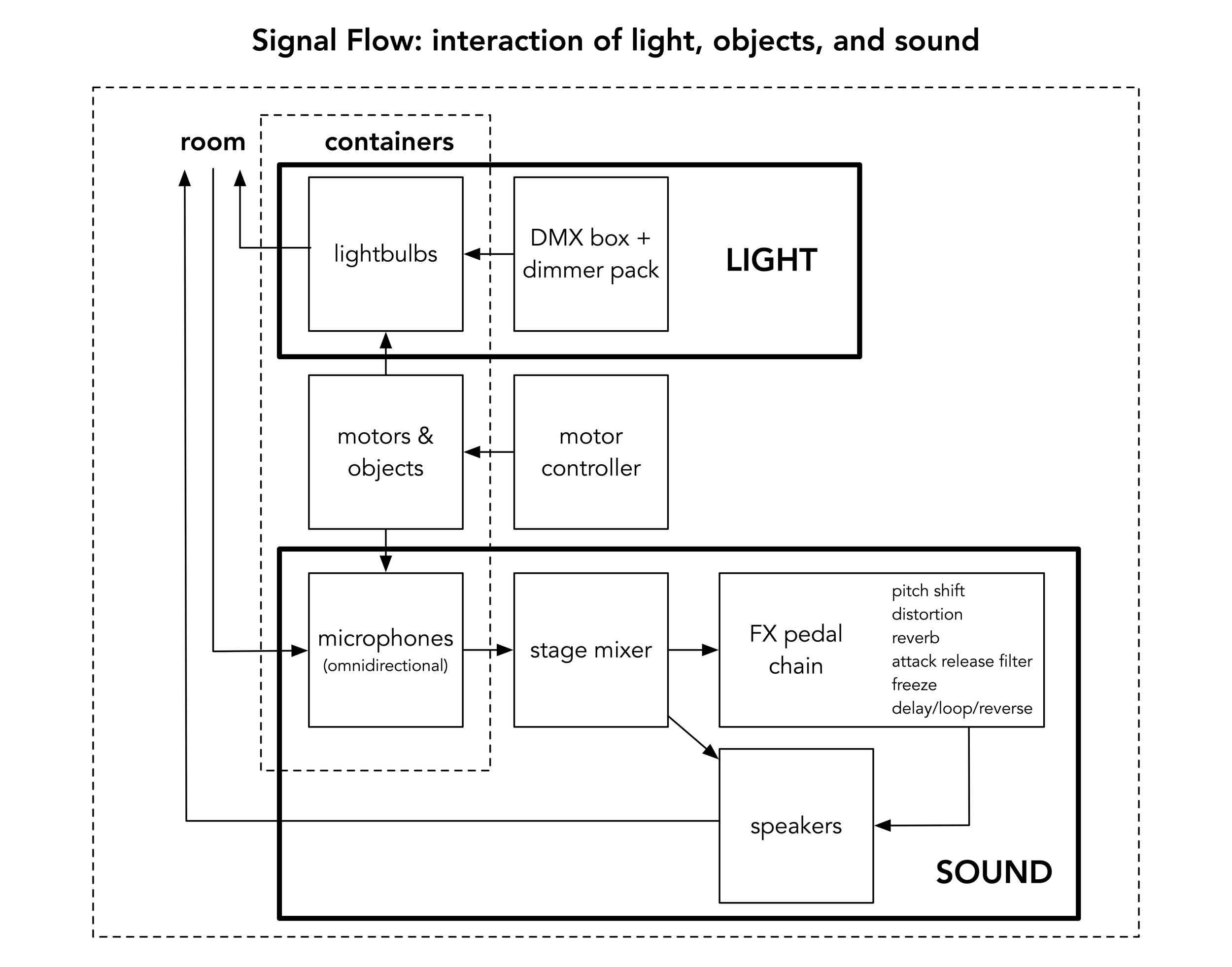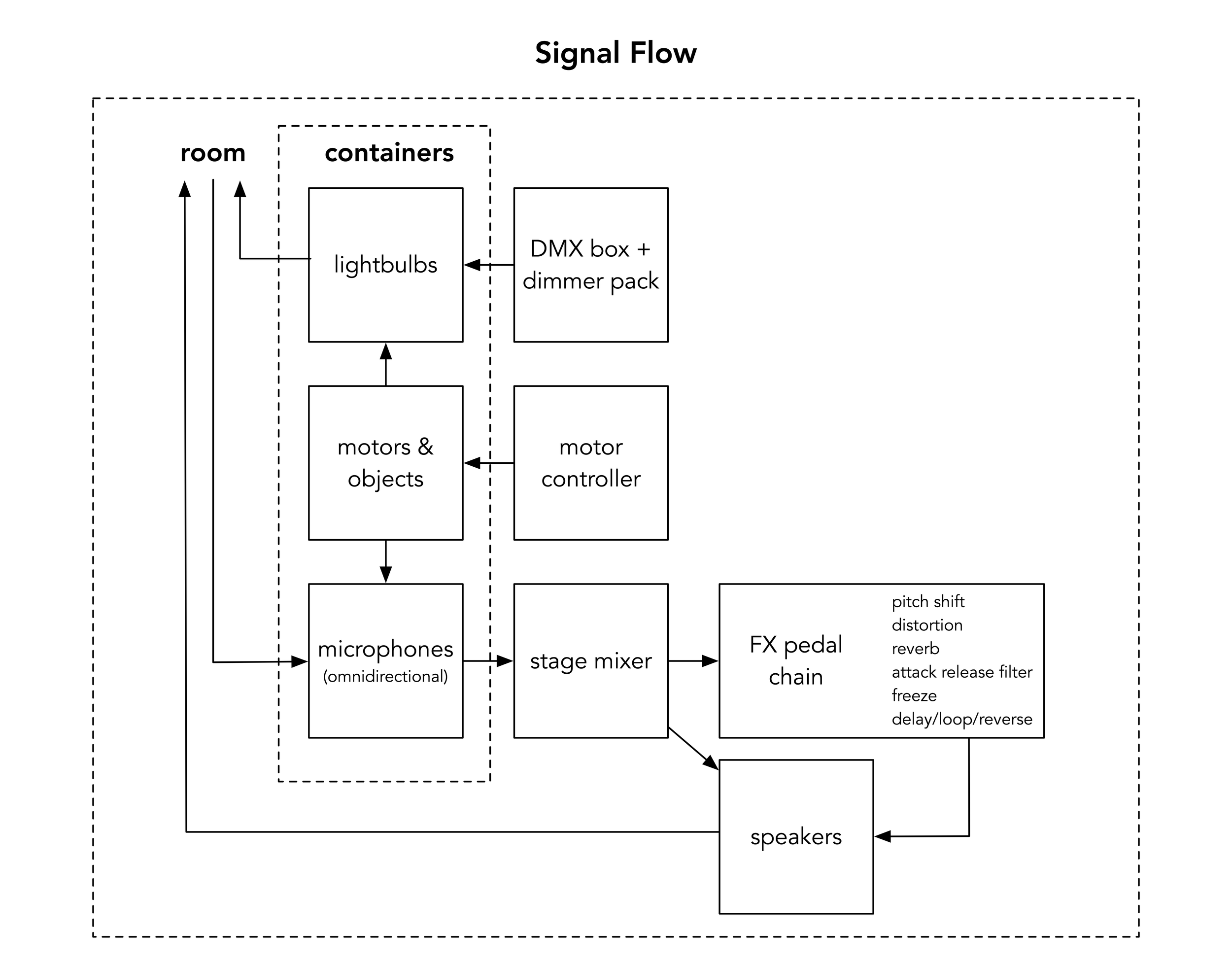 As an instrument, the lightest things float to the top comprises several containers of various sizes and qualities that are filled with found objects. The found objects are put into motion using motors hidden inside the containers. The objects’ movements are then amplified sonically using microphones and live electronic processing, and are amplified visually as moving lights and shadows projected onto the walls of the performance space.